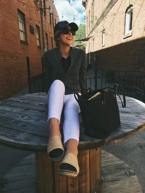 I paired my bomber with a leather Yankee's hat, a black vneck top, white jeans and my Chanel Espadrilles.